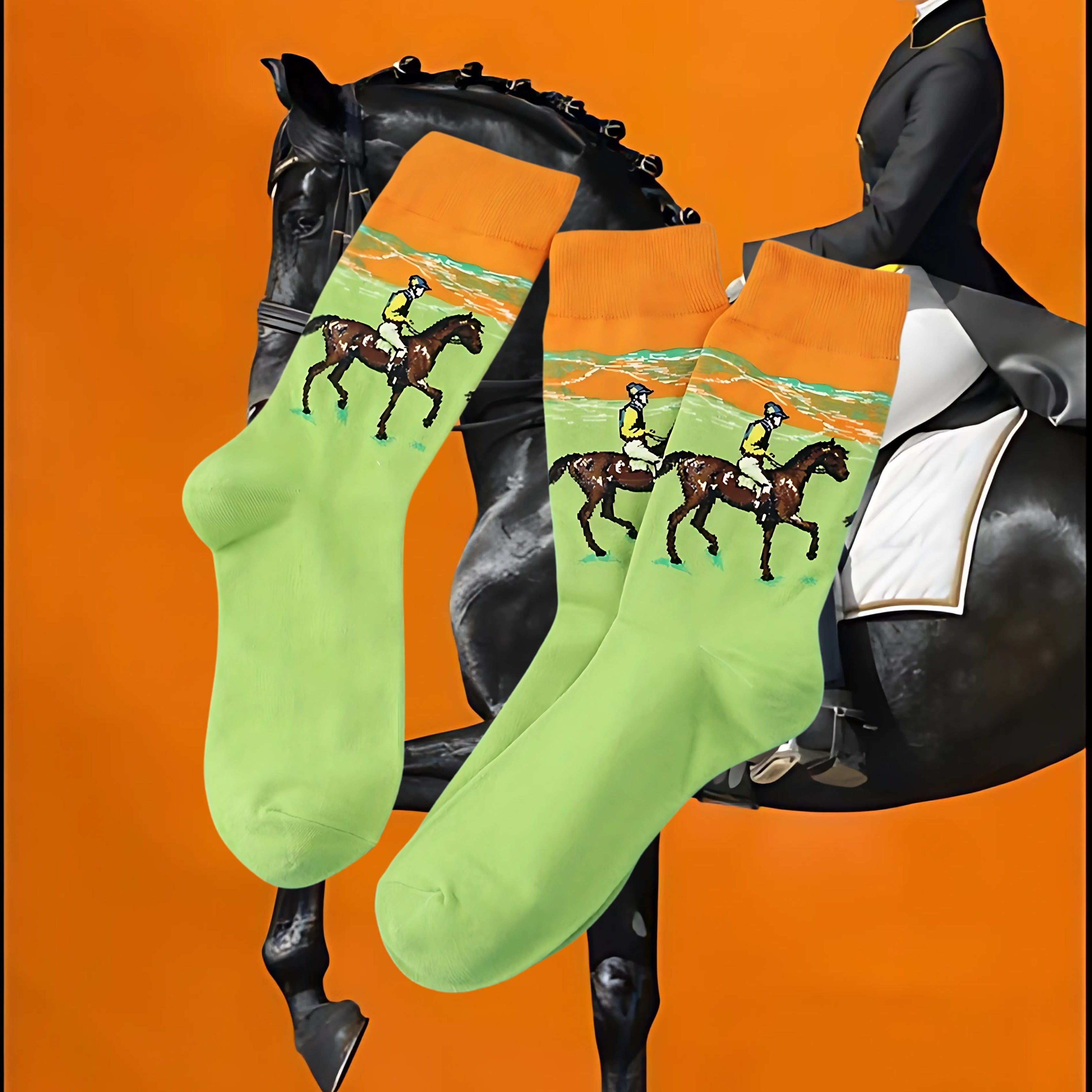 Channel the grace of the racetrack and the spirit of Impressionist art with Degas Drift. These socks pay homage to classic equestrian paintings, reimagined with modern vibrancy. From the dynamic rider to the bold sunset hues, this pair is where fine art meets everyday flair—crafted for those who walk with style and story.