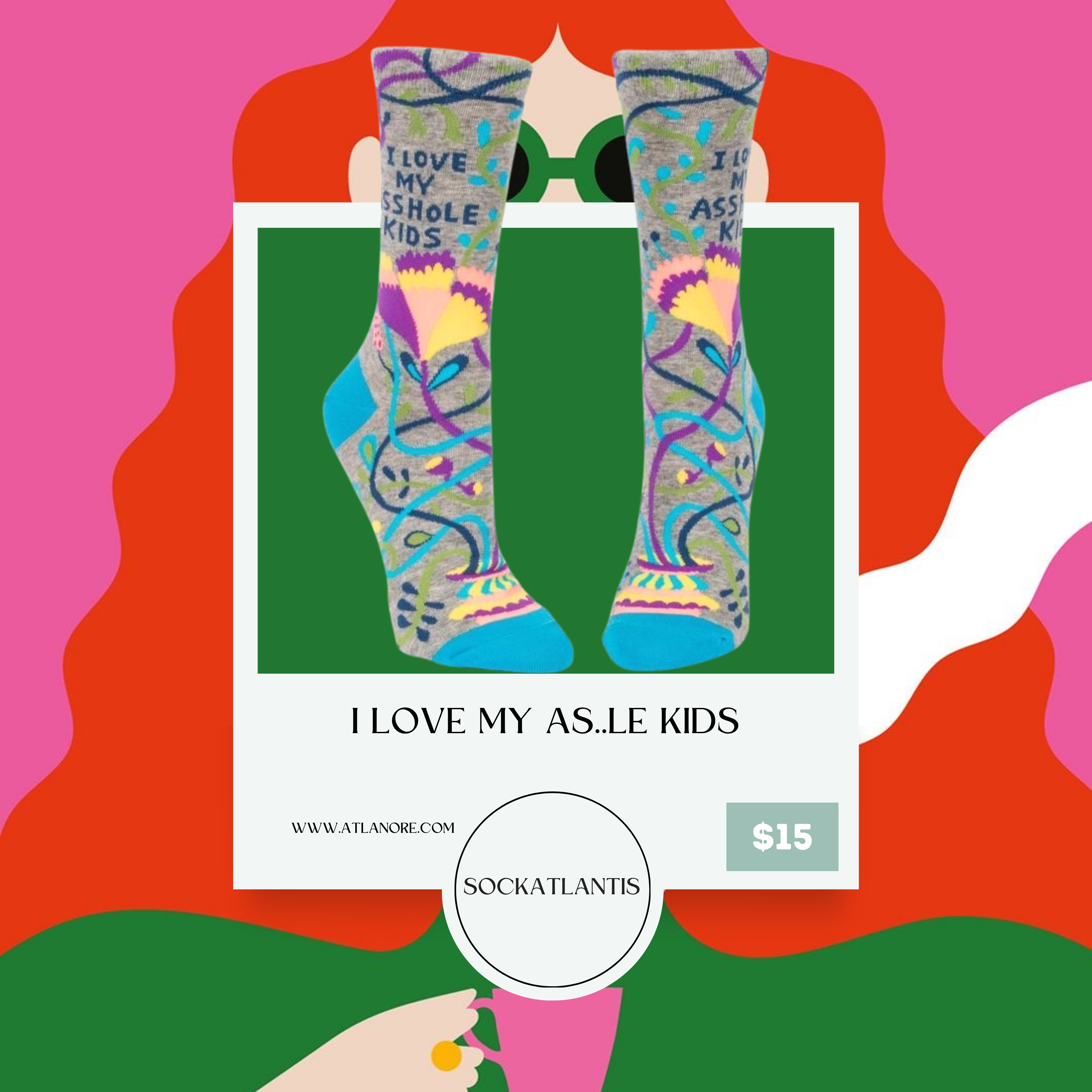 "Socks with a funny ‘I love my asshole kids’ phrase, featuring playful fonts and bold colors, making a lighthearted statement with a touch of humor."
