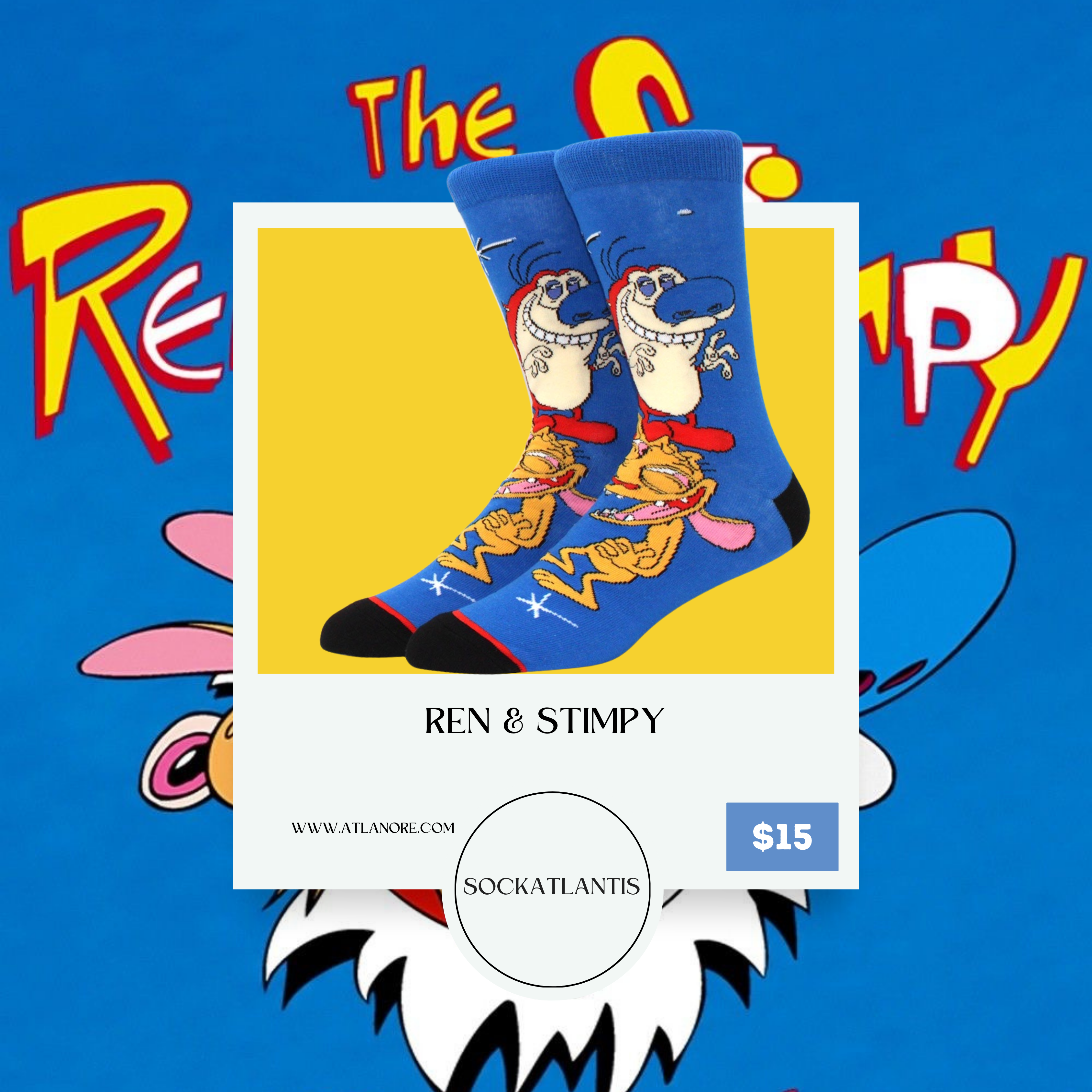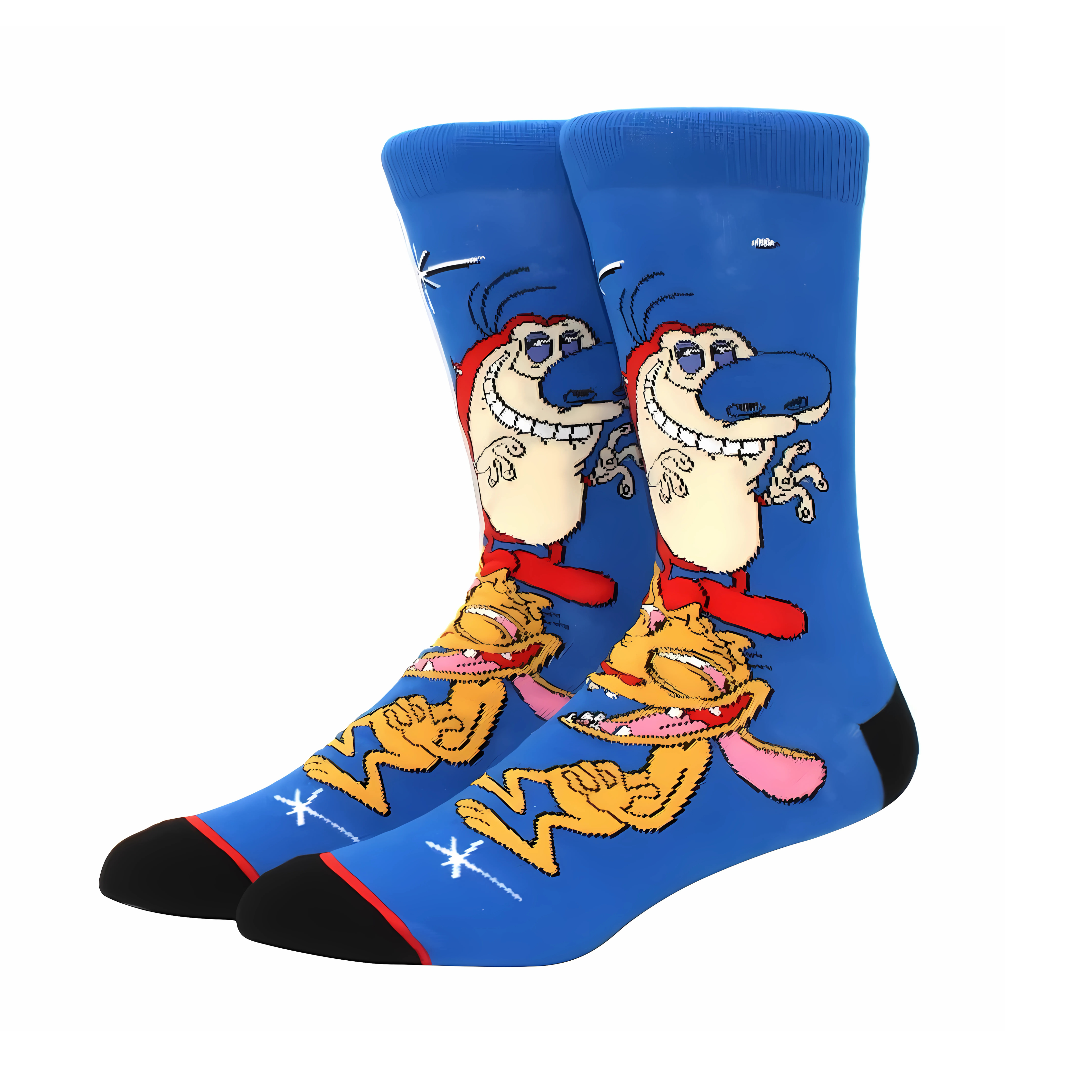 "Wild socks featuring Ren and Stimpy, with their wacky expressions, zany antics, and cartoon chaos in bright, bold colors."