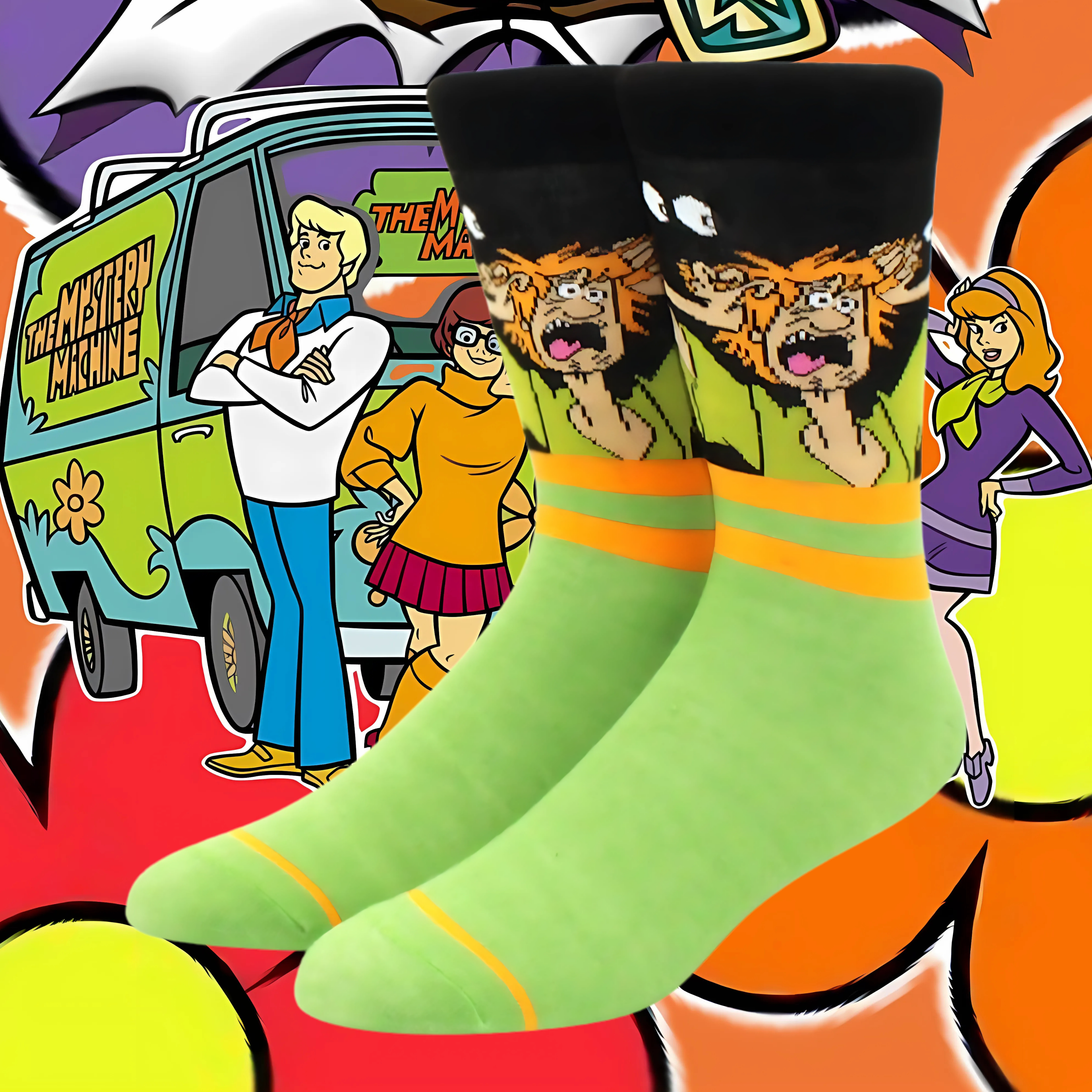 Channel Shaggy’s laid back vibes snack cravings and spooky mystery energy with these green socks made for cartoon lovers who run from ghosts but never from style.