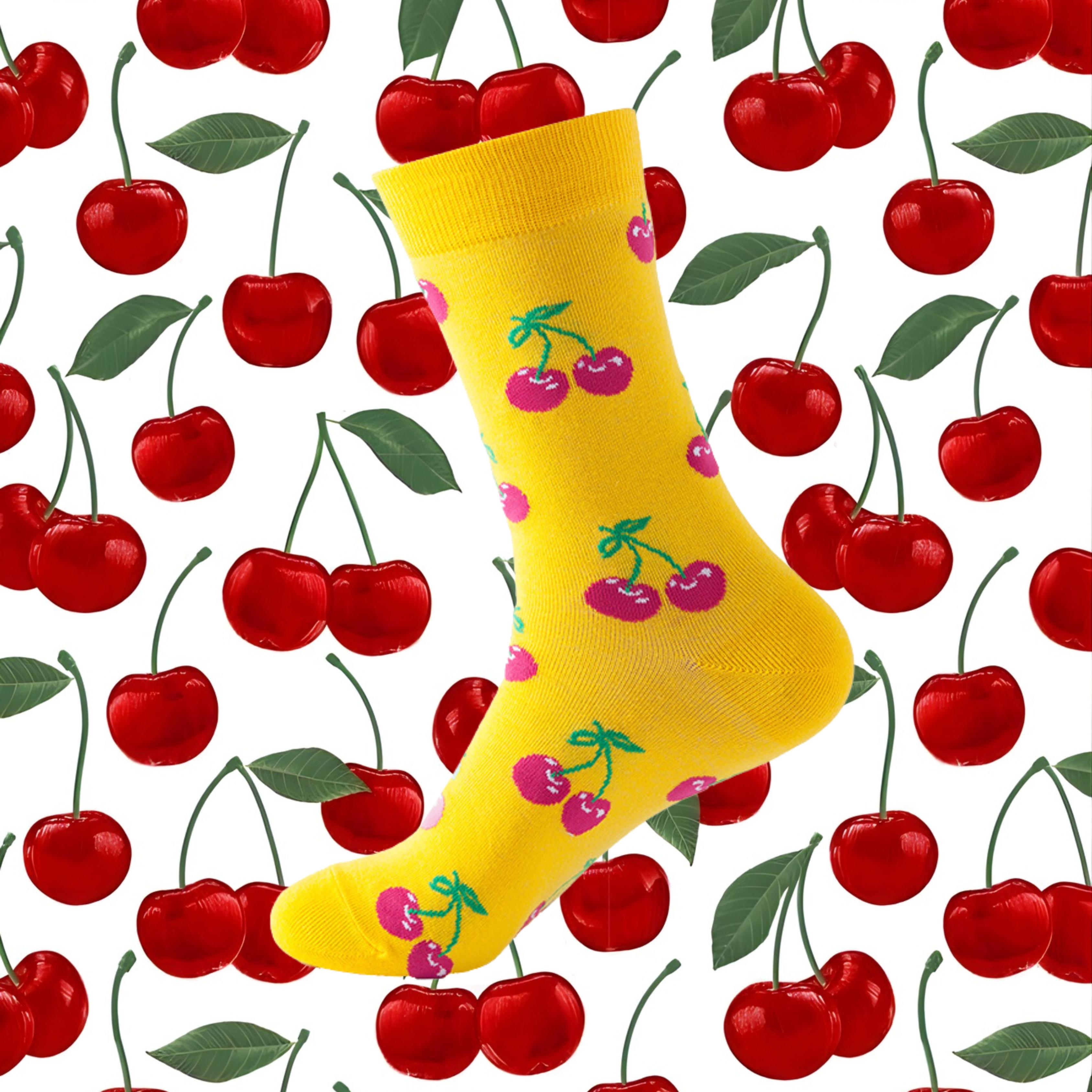 These bright yellow socks feature a vibrant print of twin red cherries with green leaves. They offer a classic, retro-fruit look that brings a cheerful energy to any outfit.